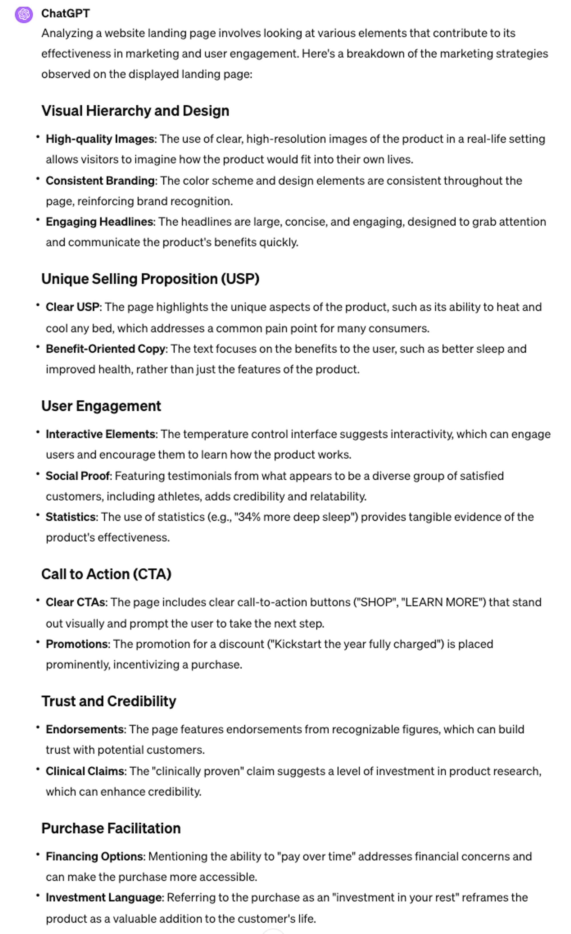 You're the world's leading marketing strategist with over 30 years experience and several awards under your belt. You're tasked with analysing all of the marketing strategies that are happening on this website landing page which is shown in the image.Note: in this scenario, we’re building a fictional tech-enabled mattress company, DreamTech Beds, so our competitor is eightsleep.com