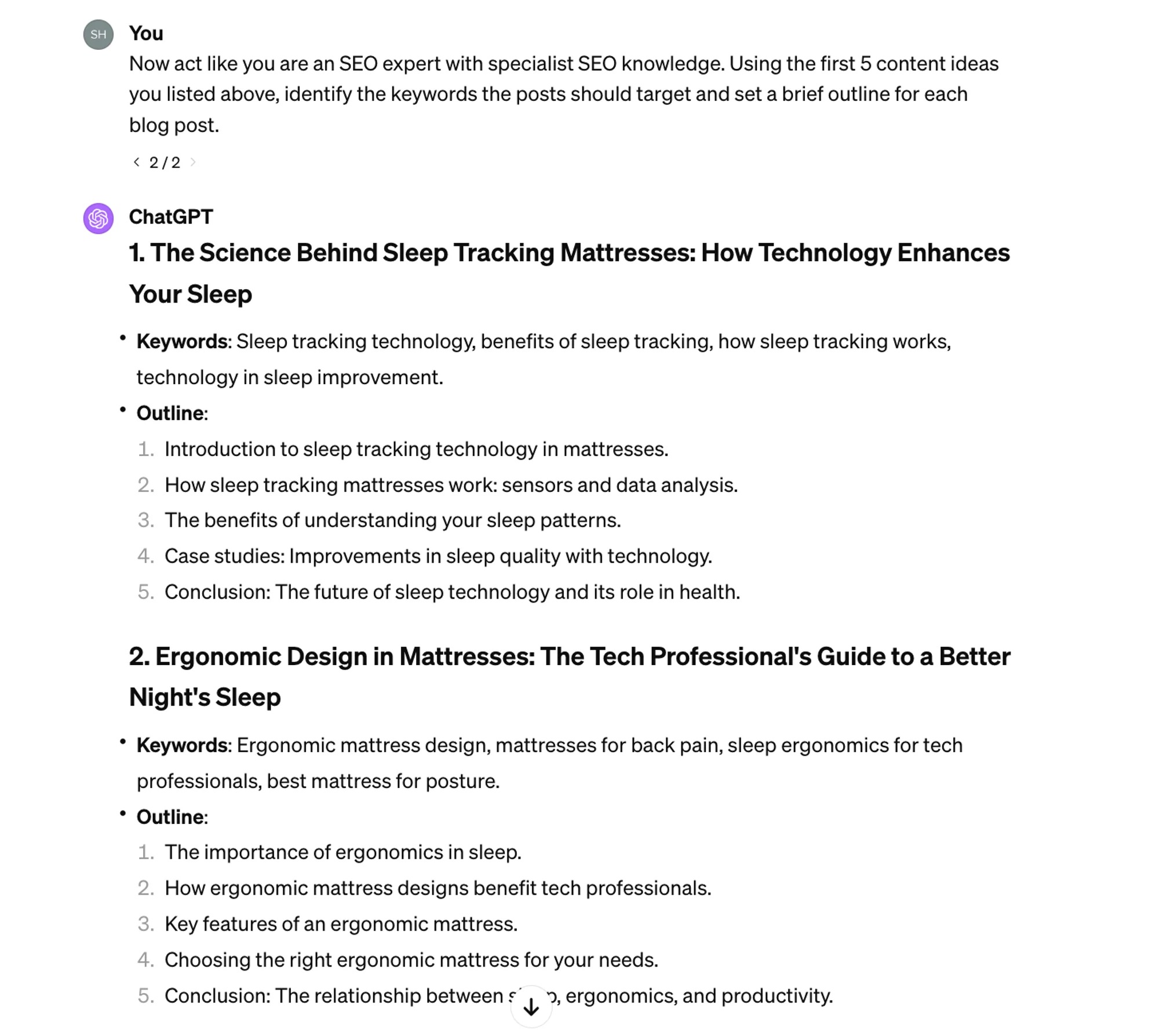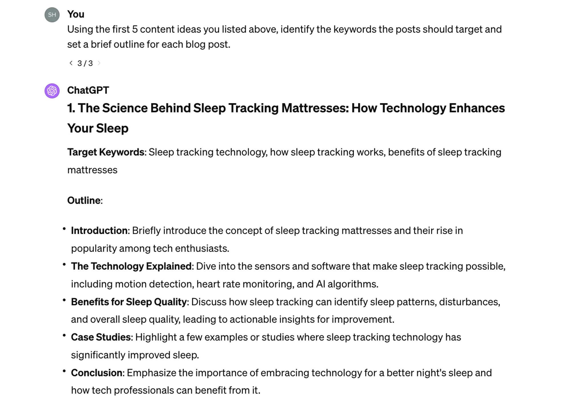 Now let’s ask ChatGPT to come up with the target keywords and outlines for this blog content—you can also use it to generate a lot of the actual blog content too.