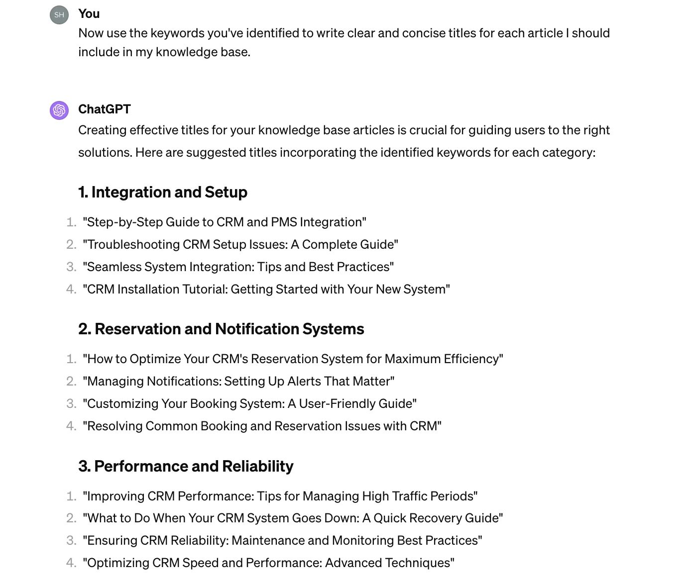 Now use the keywords you've identified to write clear and concise titles for each article I should include in my knowledge base.
